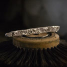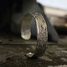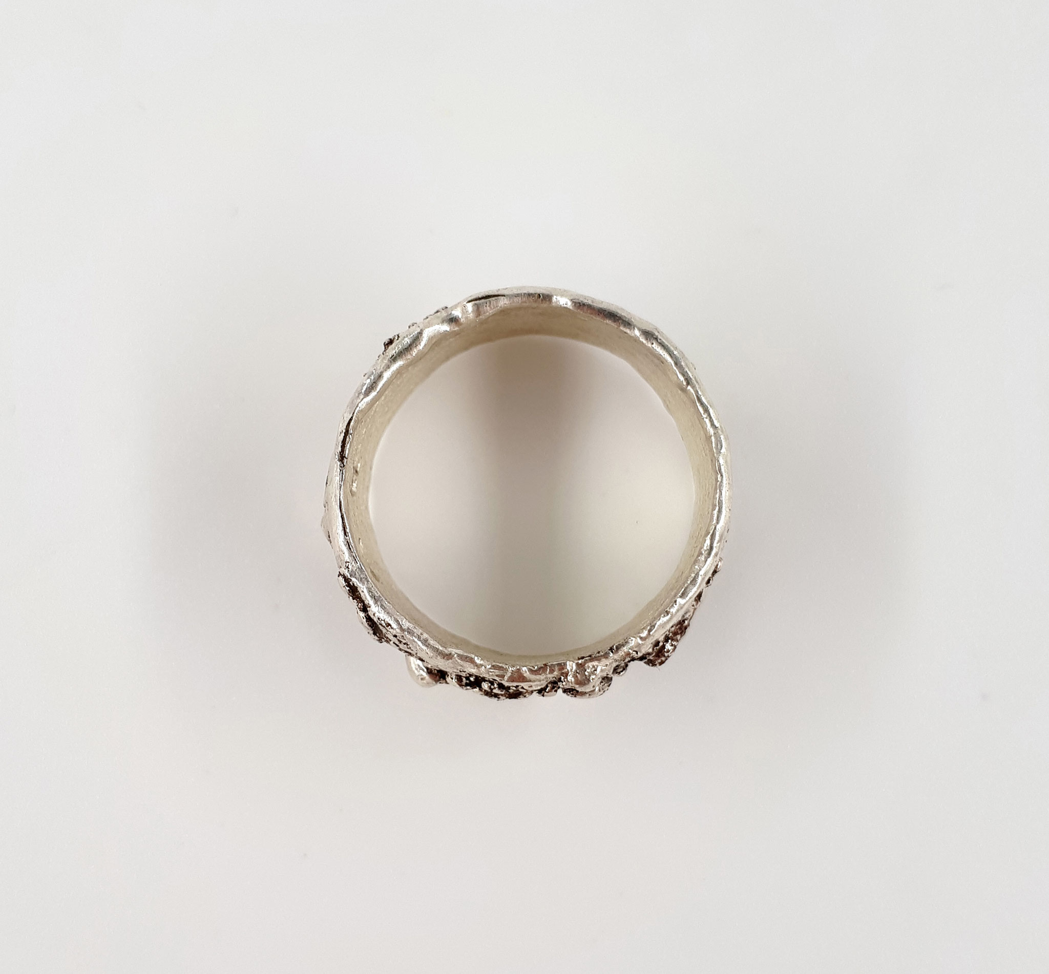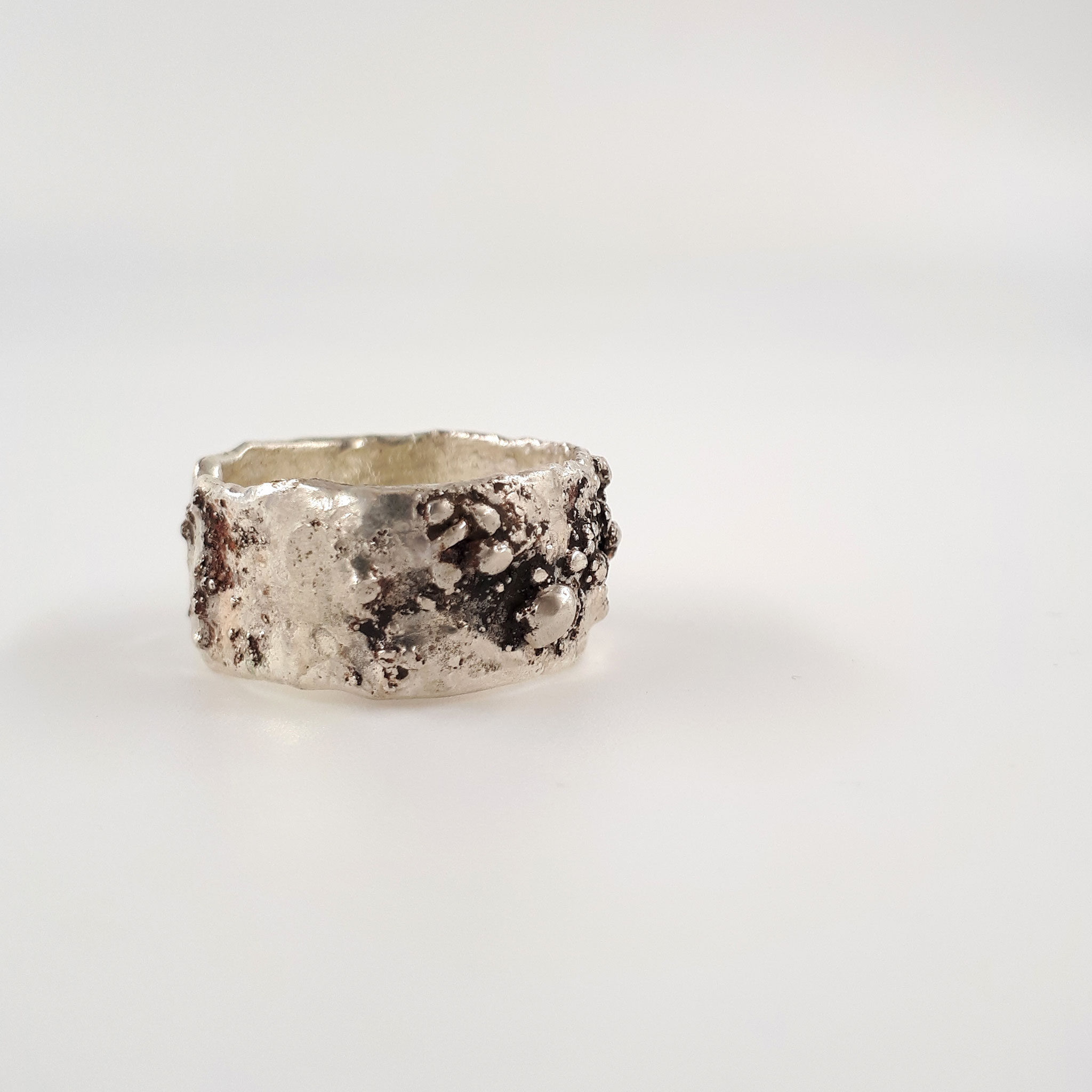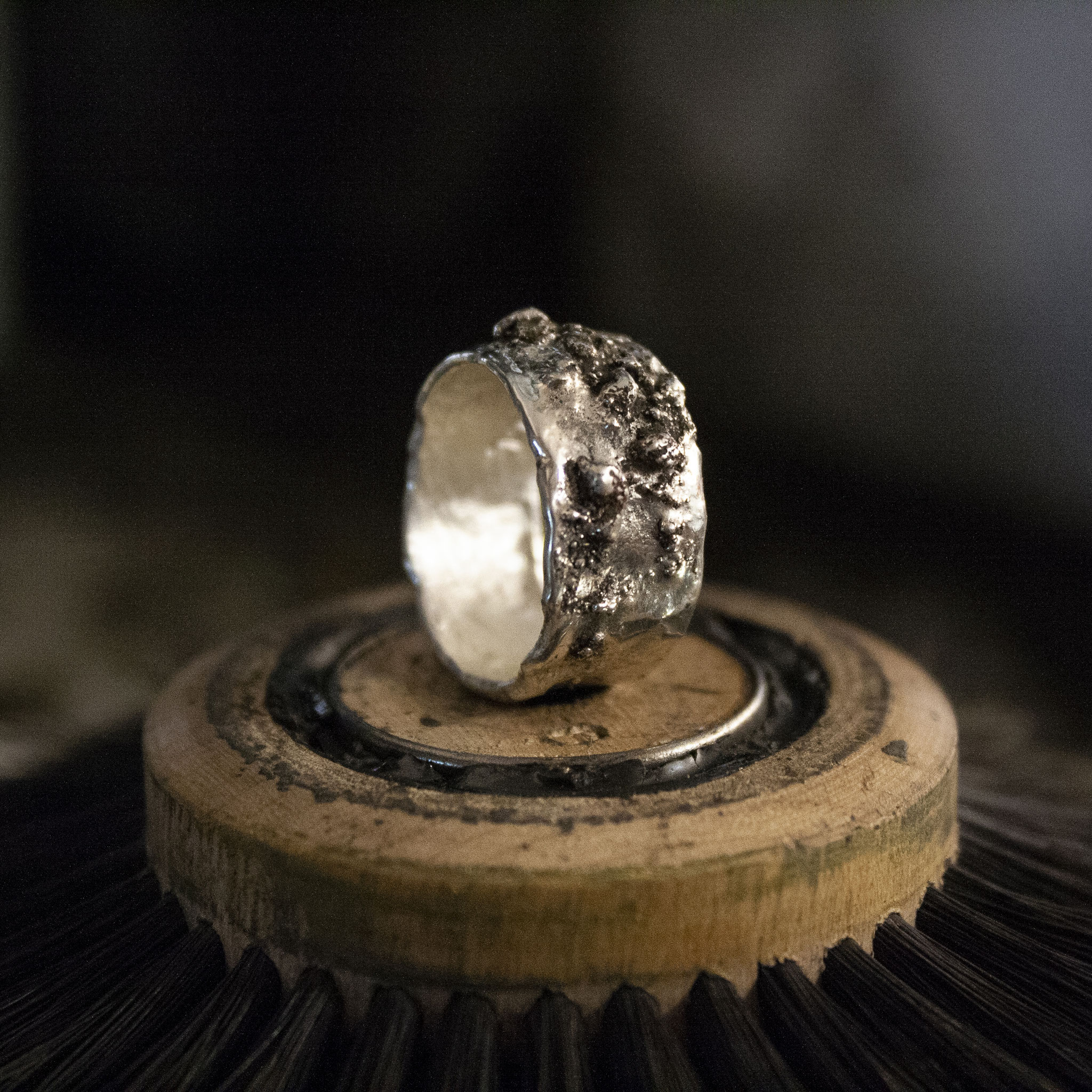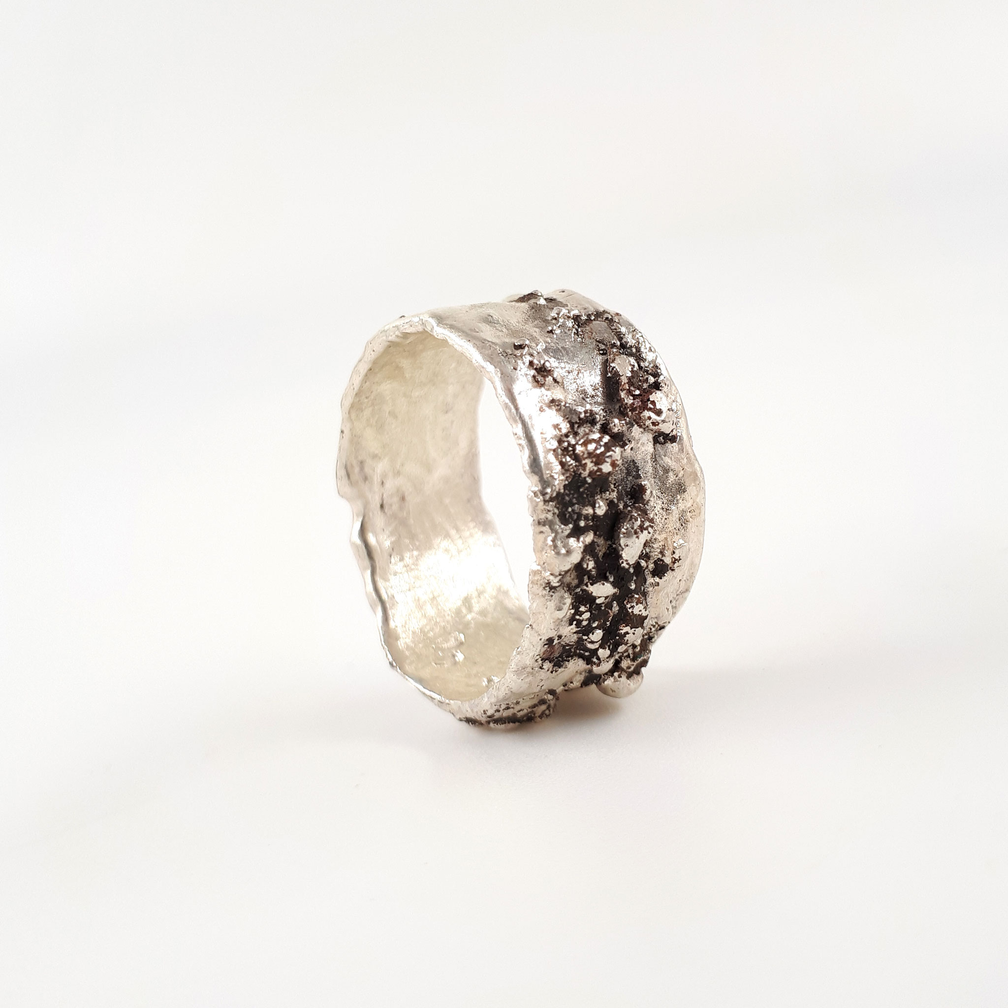 L’anello è realizzato in lastra e limatura d’argento abilmente fuse insieme, conferendo così questo particolare aspetto “materico”.
