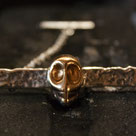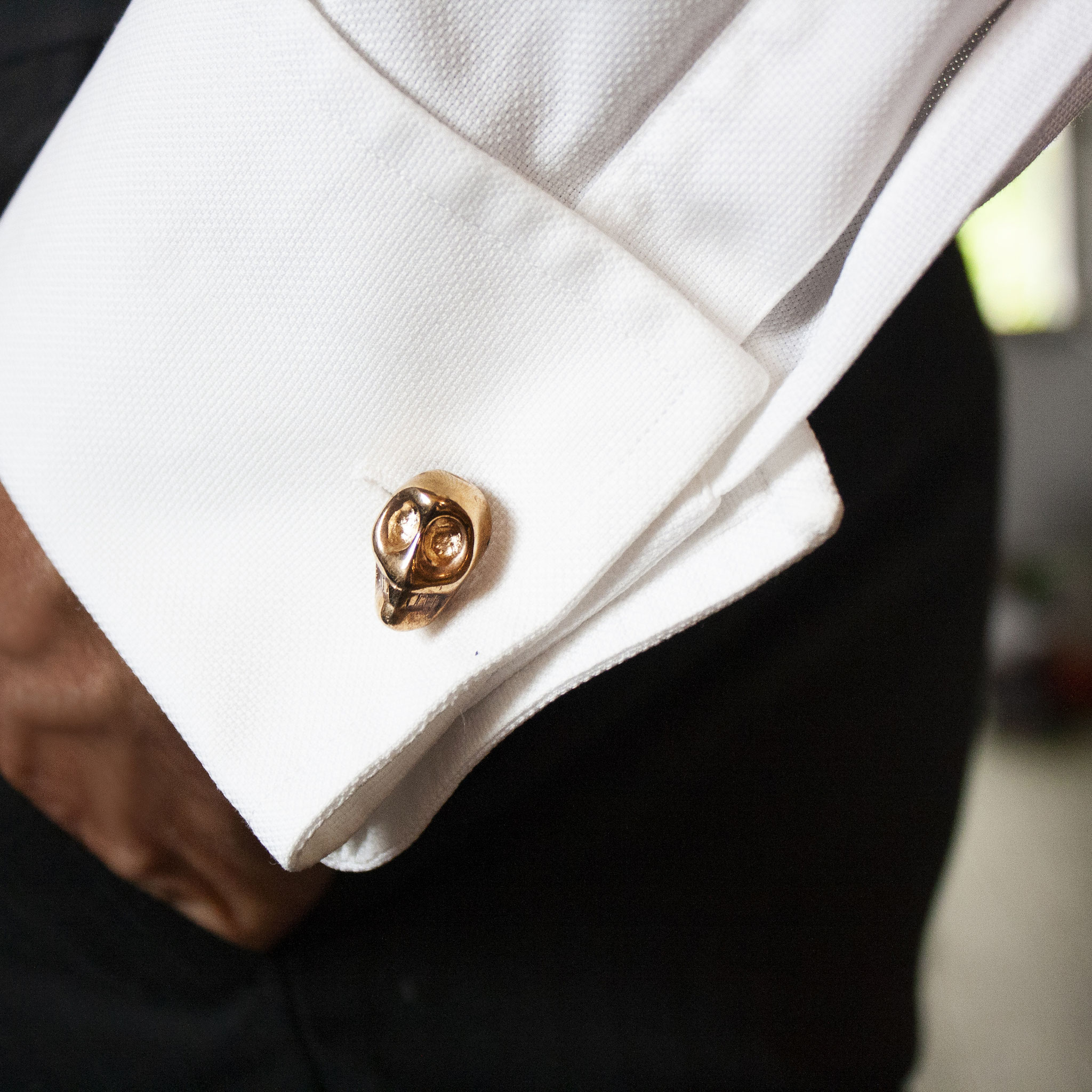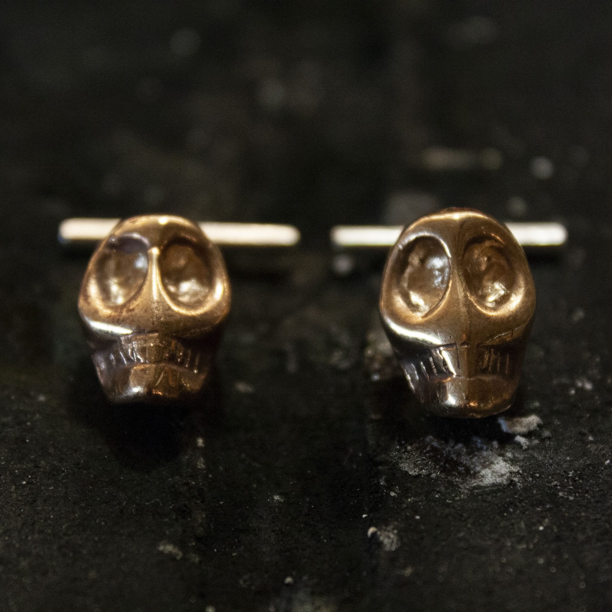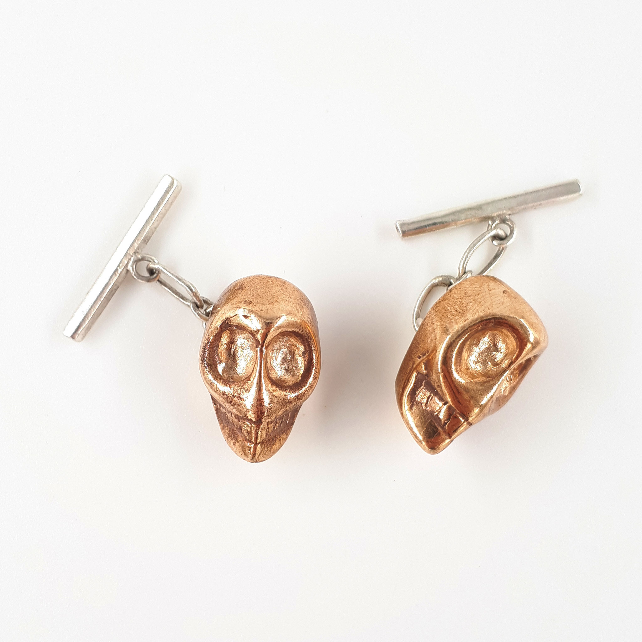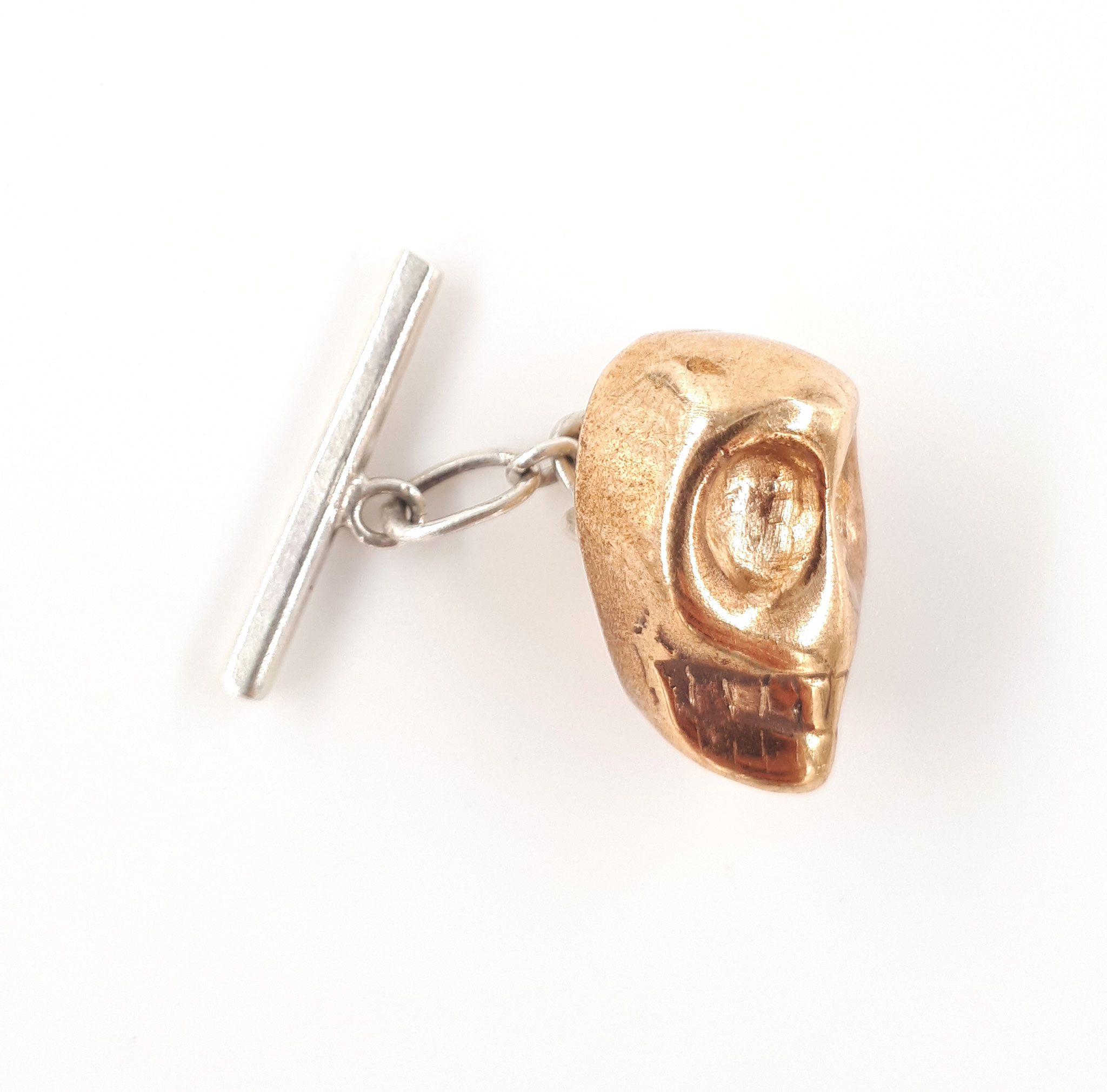Il teschio è realizzato in fusione a cera persa in bronzo rosso, la barretta, costituita da un filo a sezione quadrata è realizzata a mano.