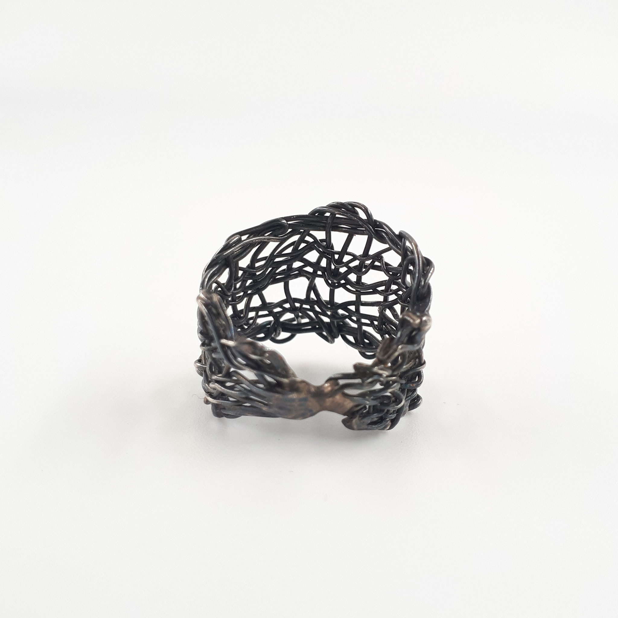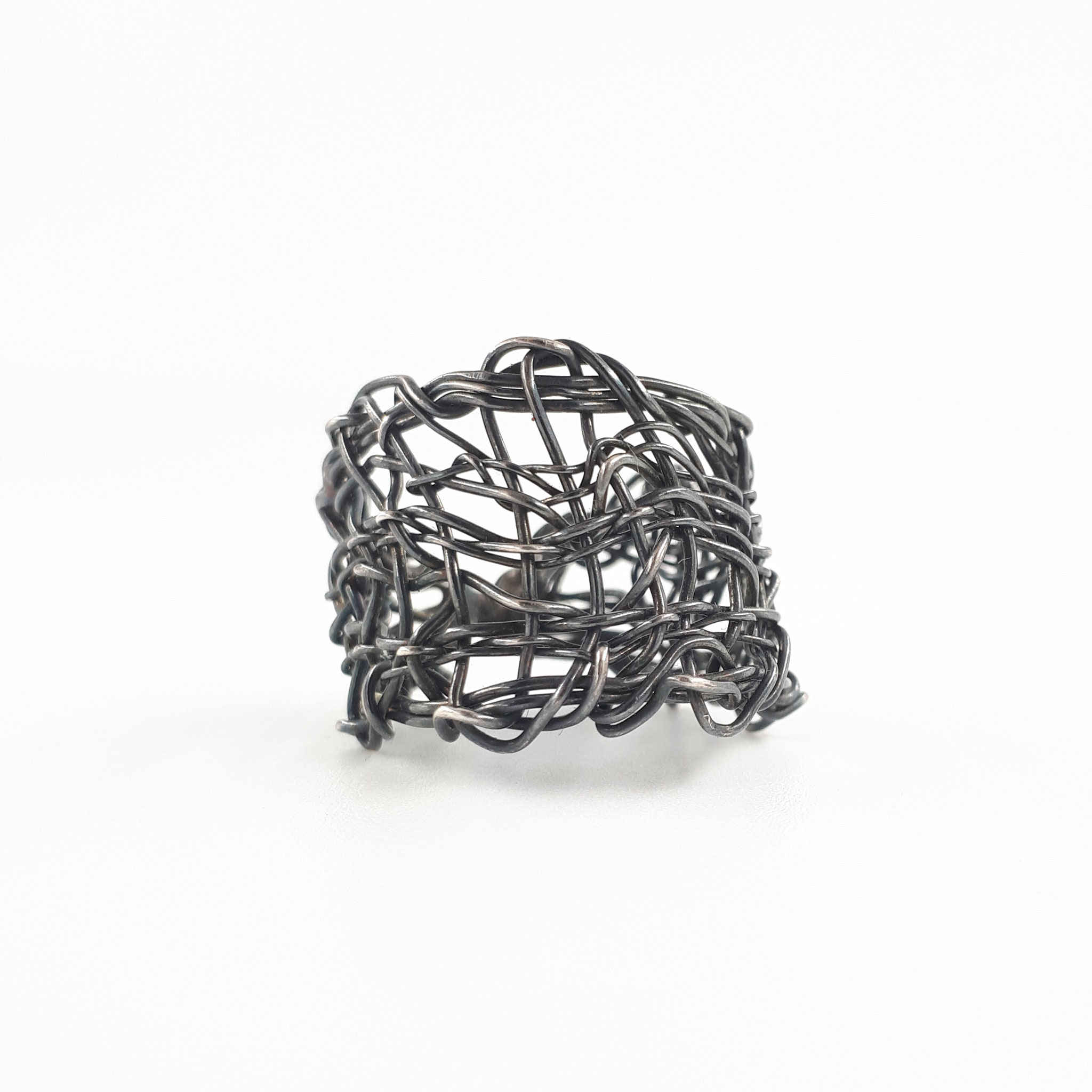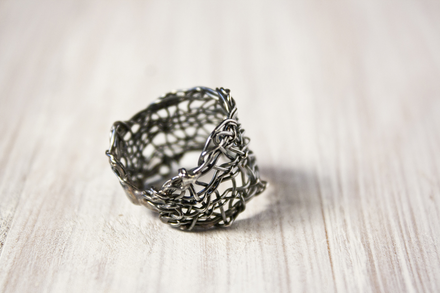 L’anello è realizzato in fili d’argento 925 intrecciati tra loro mediante l’ausilio di fuselli di legno, particolare tecnica di lavorazione del merletto canturino.