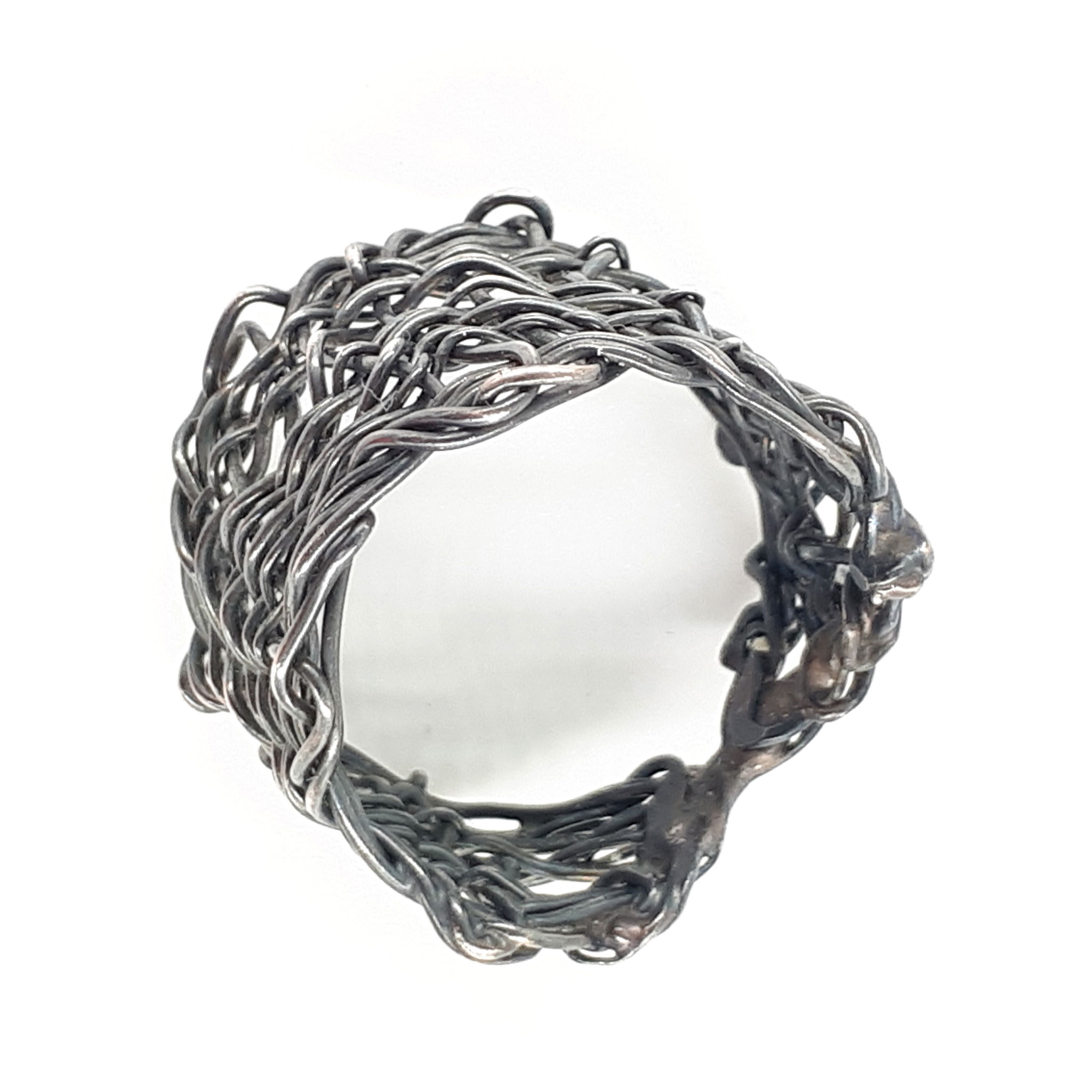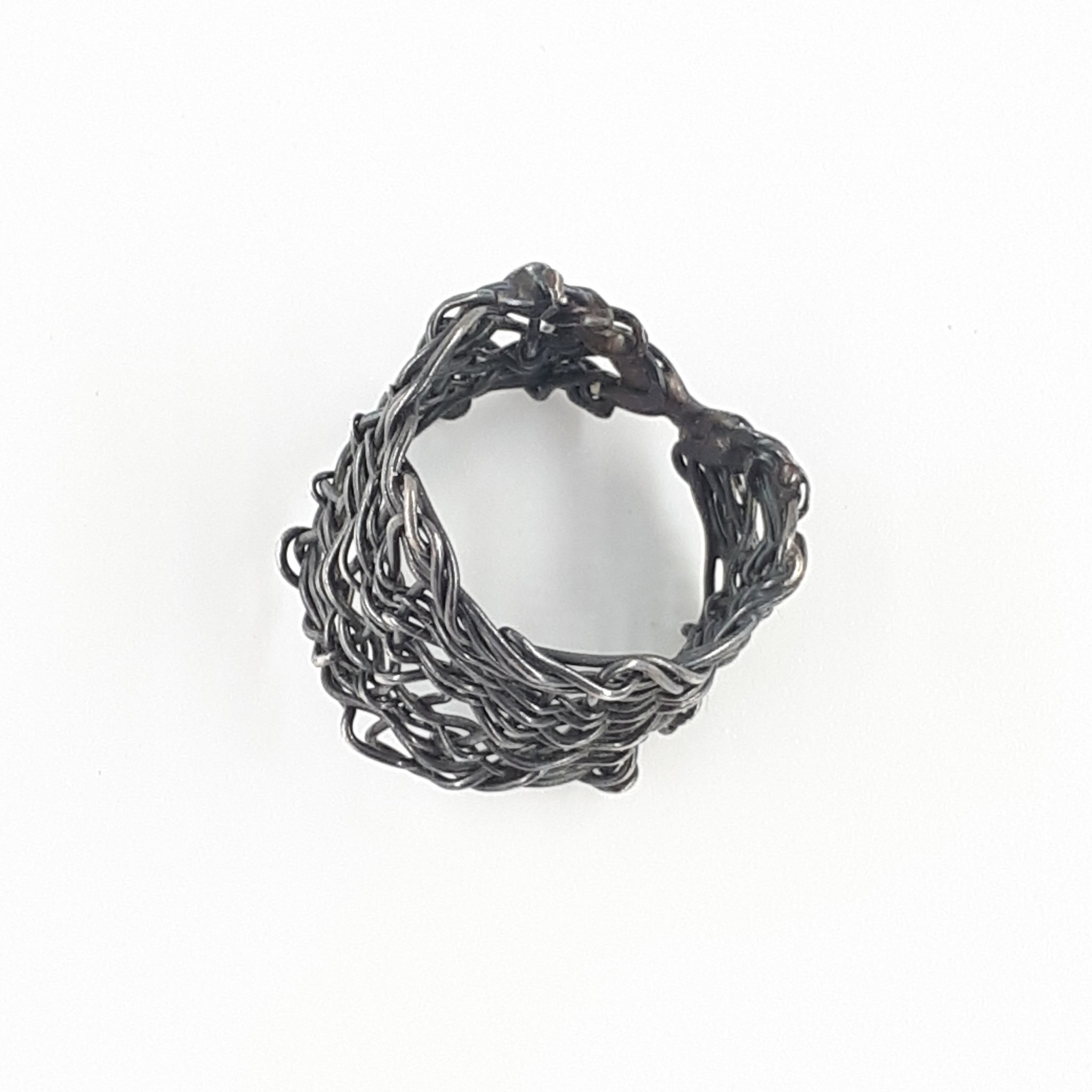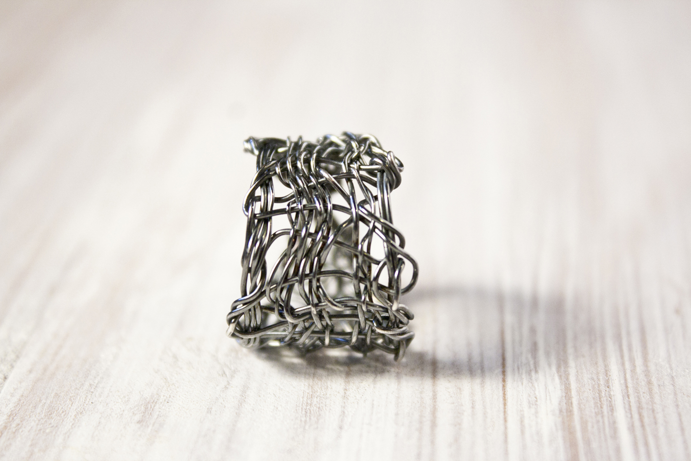 L’anello è realizzato in fili d’argento 925 intrecciati tra loro mediante l’ausilio di fuselli di legno, particolare tecnica di lavorazione del merletto canturino.